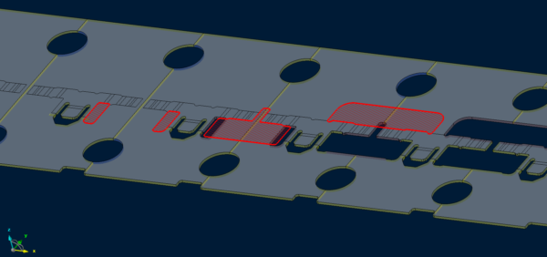 順送プレス加工では、製品の外形や穴は、通常は一度で加工せずに、下記のように複数回に分けて抜き加工をします。赤い部分がパンチで抜く箇所です。