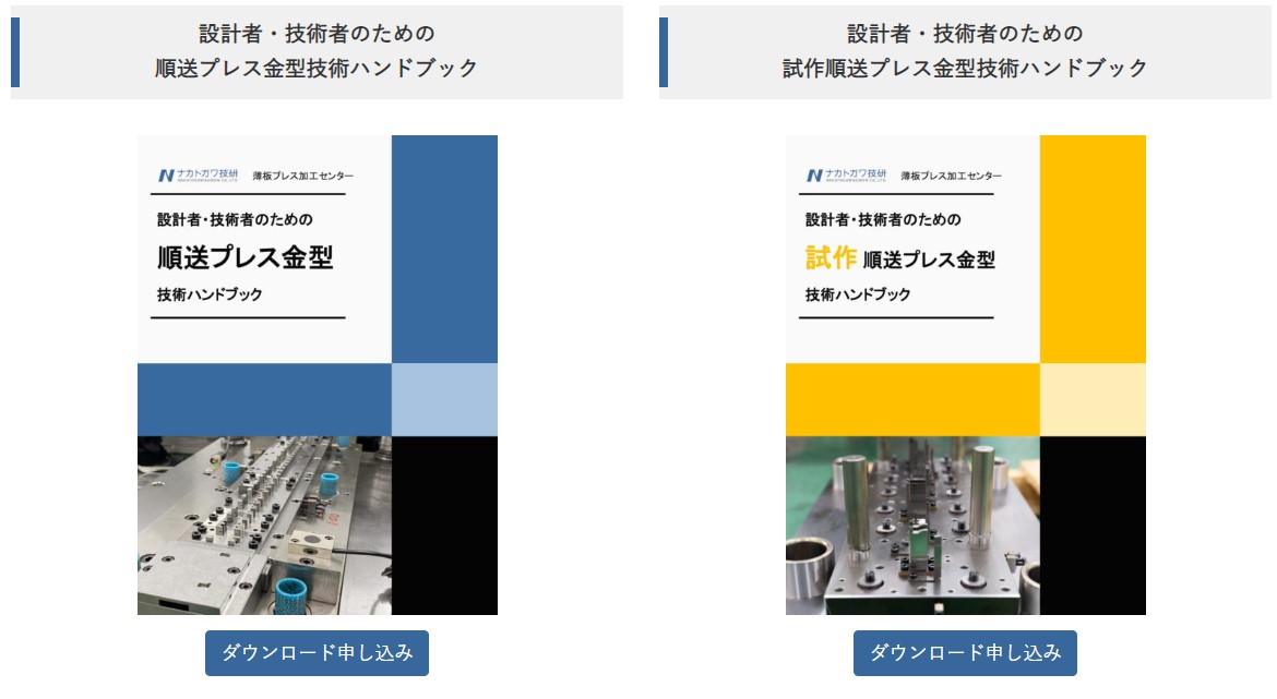 薄板プレス加工センターを運営する株式会社ナカトガワ技研が作成した、数種類のハンドブックをすべて無料でダウンロードできます。順送プレス金型や薄板プレス加工など、幅広く設計者の方々のための情報をまとめています。1つだけの資料ダウンロードから、すべてまとめてダウンロードもできます。