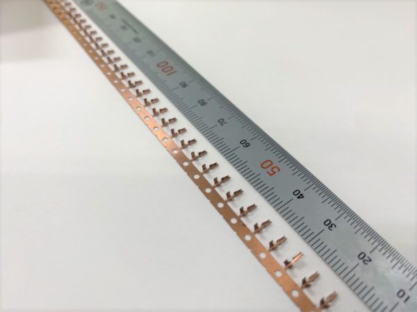 こちらは自動車業界で使用されるC7025-TM03製のプレスフィット端子です。板厚は0.64mm、ピッチは2.2mmで、試作順送金型にて製造いたしました。