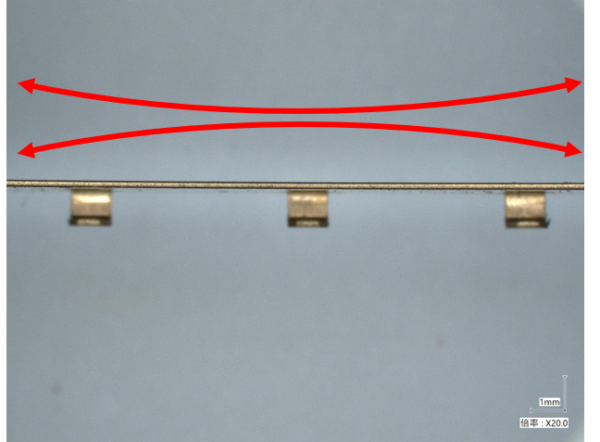 当社が過去に撮影した製品写真の中では、反りが明確に生じている製品写真がなかったため、下記のとおり製品外観写真に矢印でイメージを追加して表現しています。