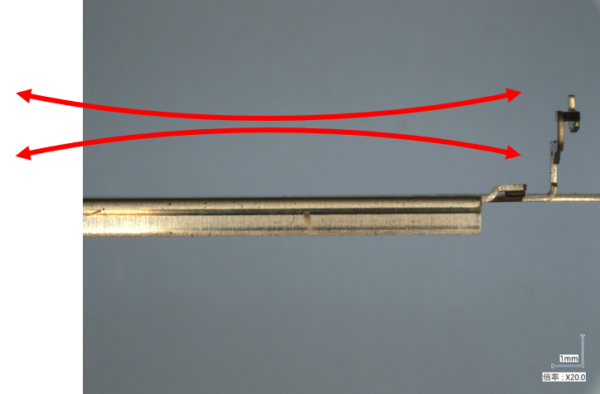 またコイル材の場合、その巻き癖が反りに影響することもあります。1mm以下のピッチではあまり関係ないものの、特に30mm以上の長いピッチで加工を行う場合、巻き癖の影響が大きくなる傾向にあります。