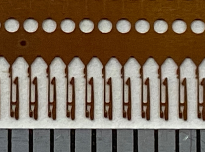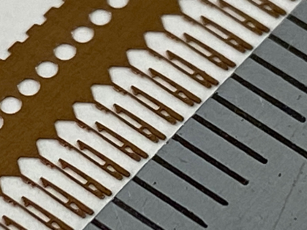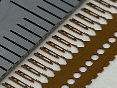 こちらは、電子部品として使用される、リン青銅(C5240R)製のFPCコネクタ端子です。板厚は0.08mm、ピッチは0.9mmで、試作順送金型にて製造いたしました。