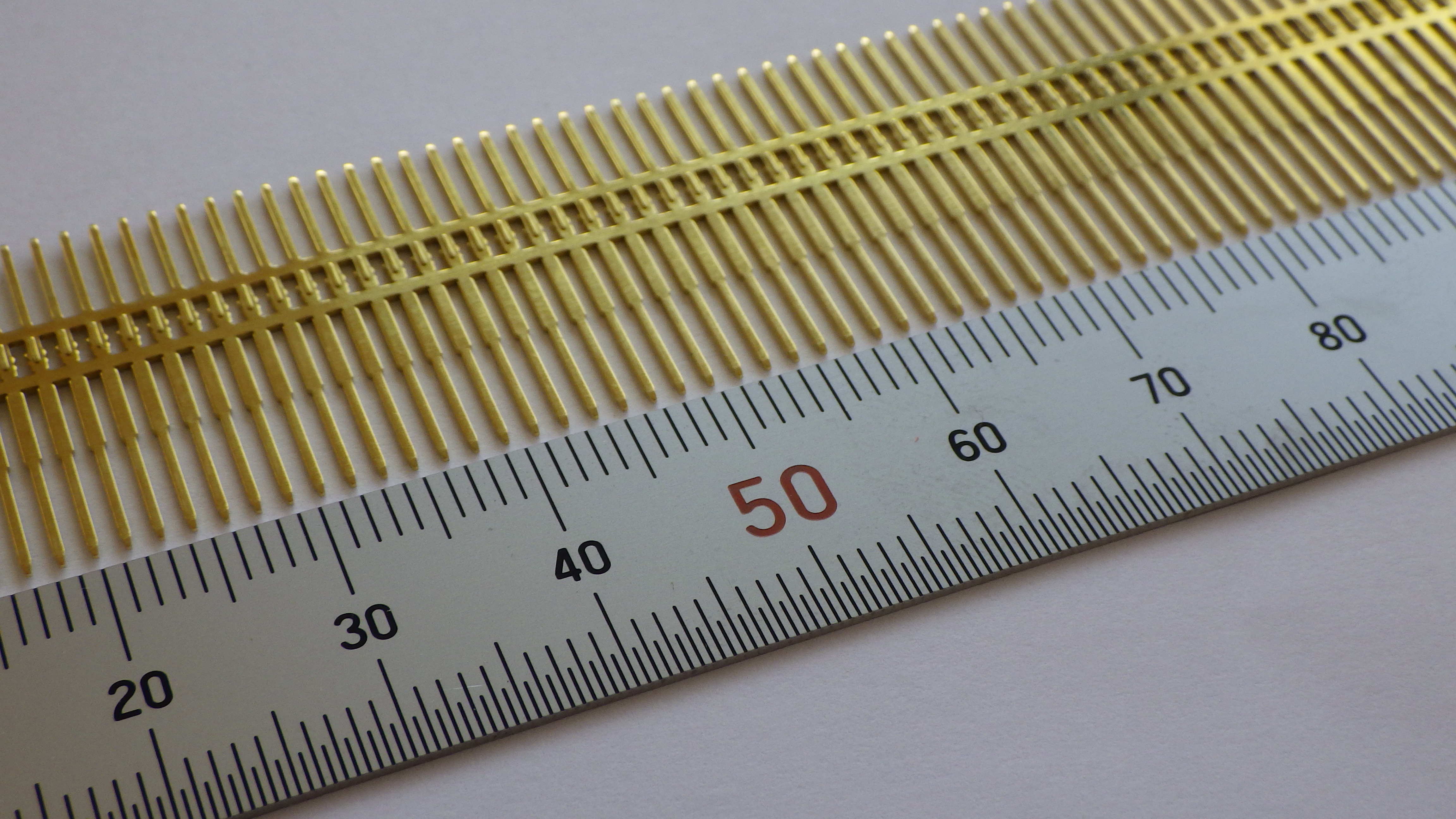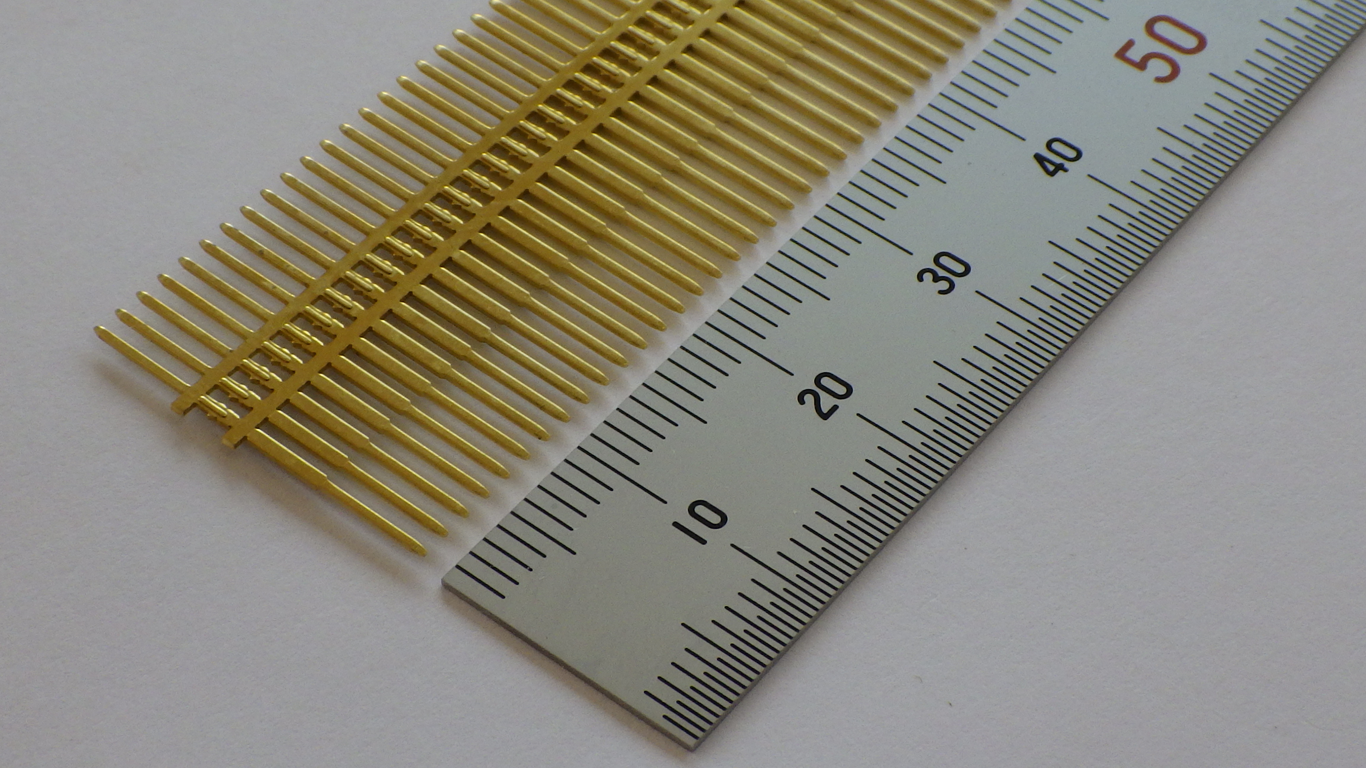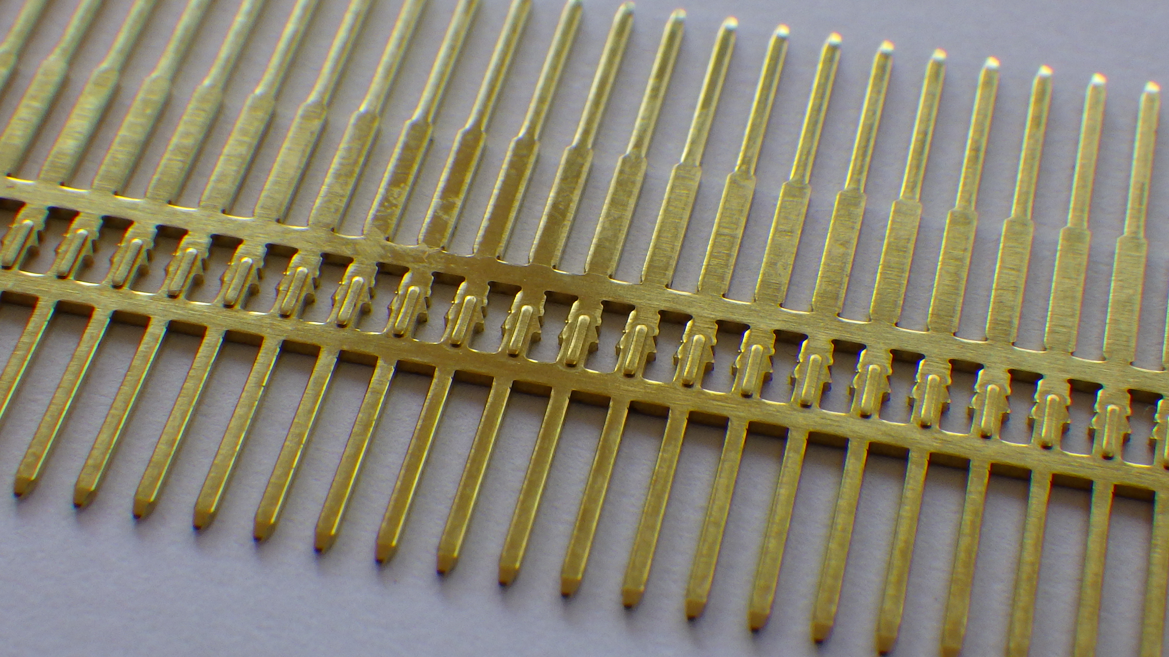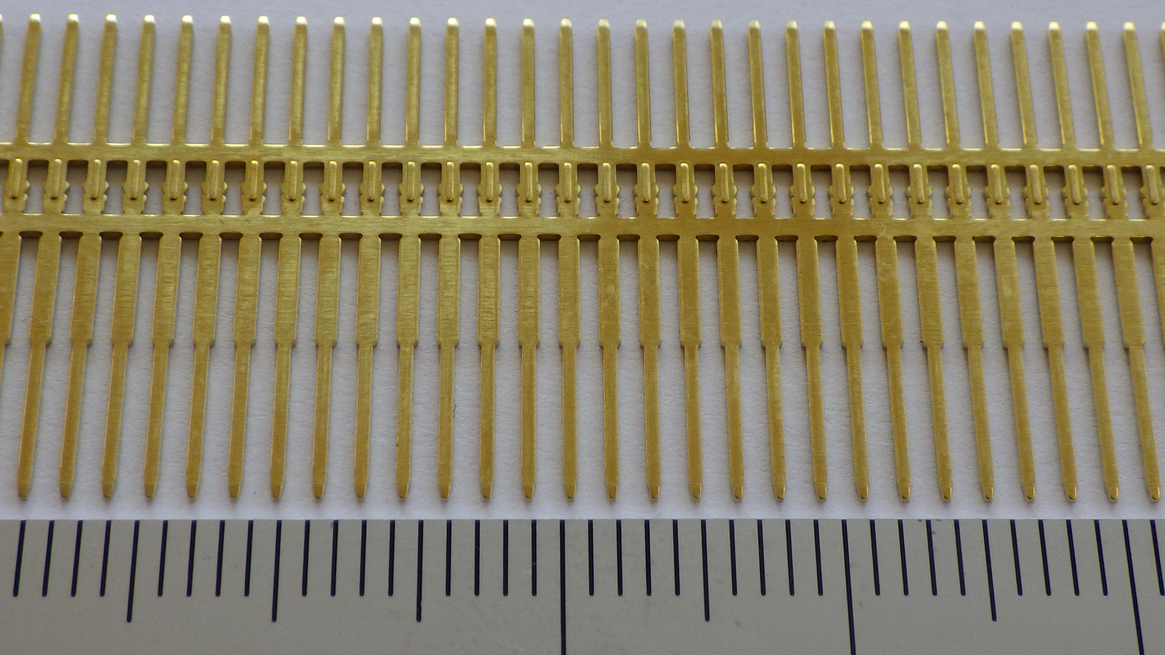 こちらは、真鍮(C2600R-H)製のターミナルです。板厚は0.4mm、ピッチは1.5mmで、試作順送金型にて製造いたしました。