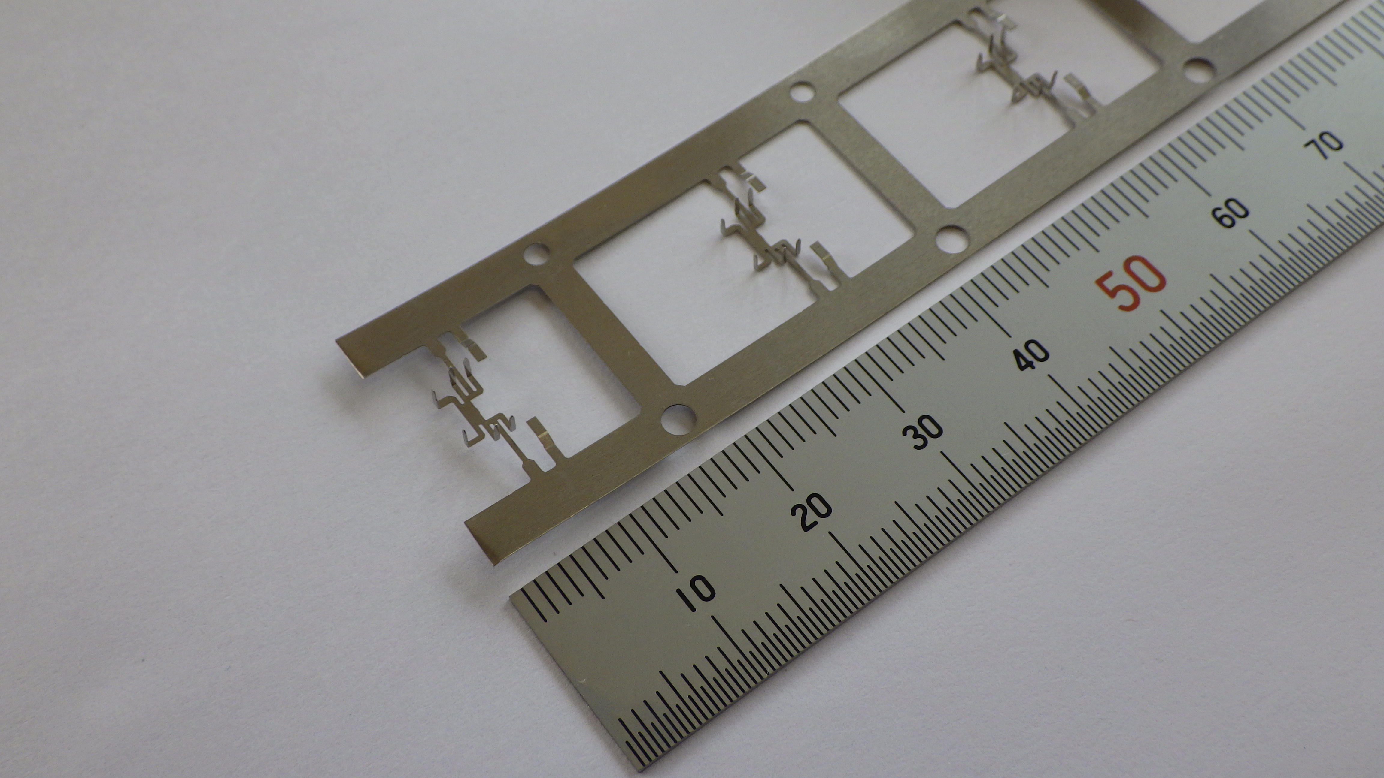 こちらは、Fe-Ni合金(42アロイ)製のリードフレームです。板厚は0.15mm、ピッチは25.5mmで、量産順送金型にて製造いたしました。