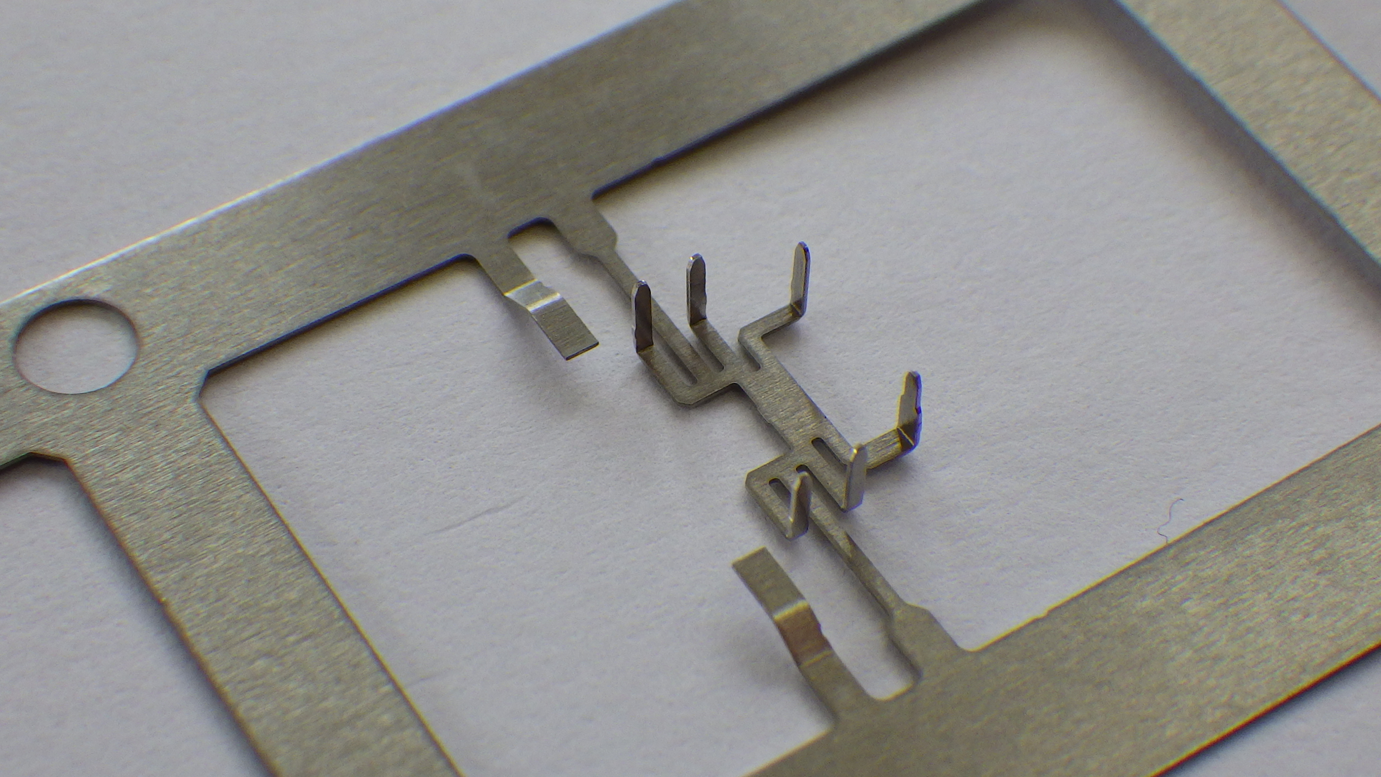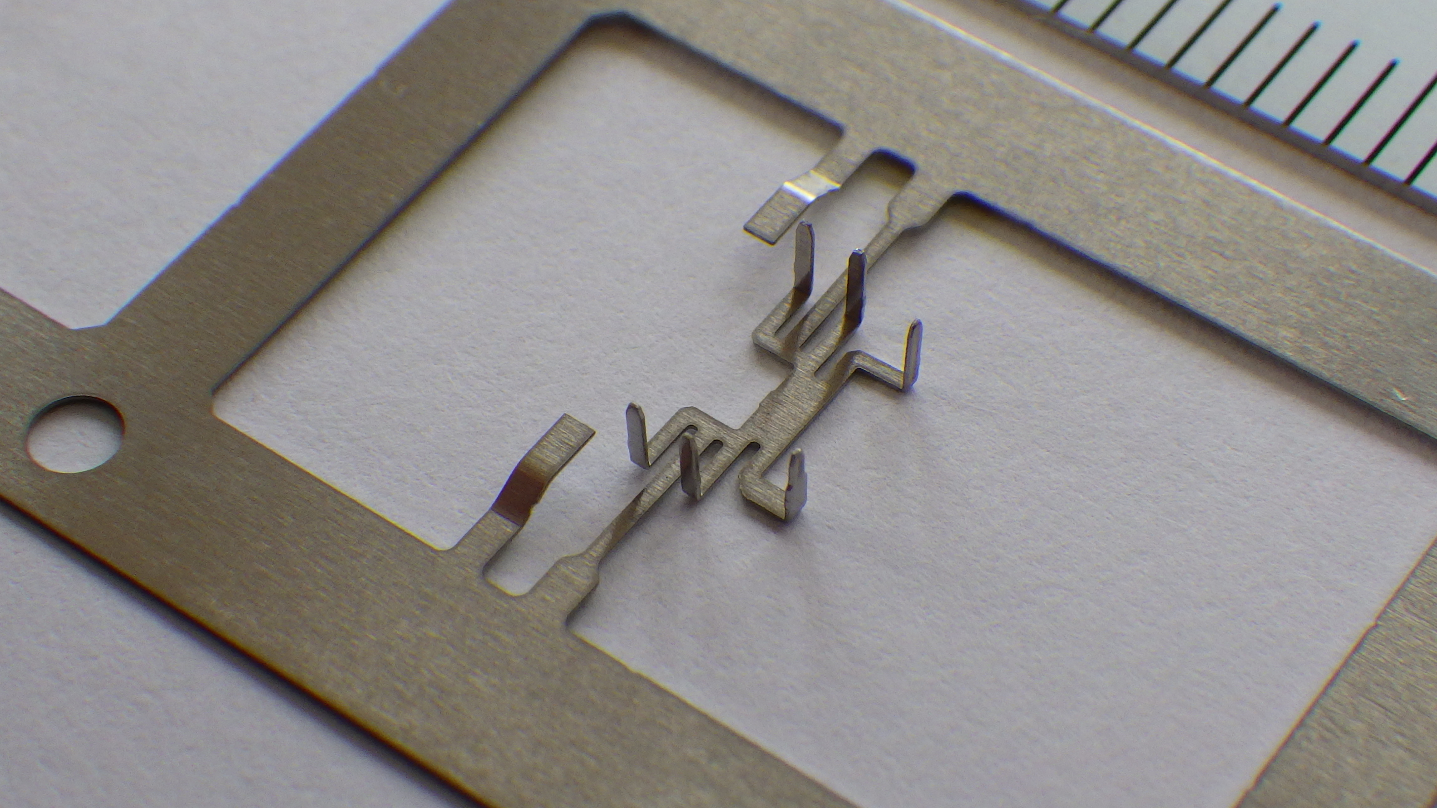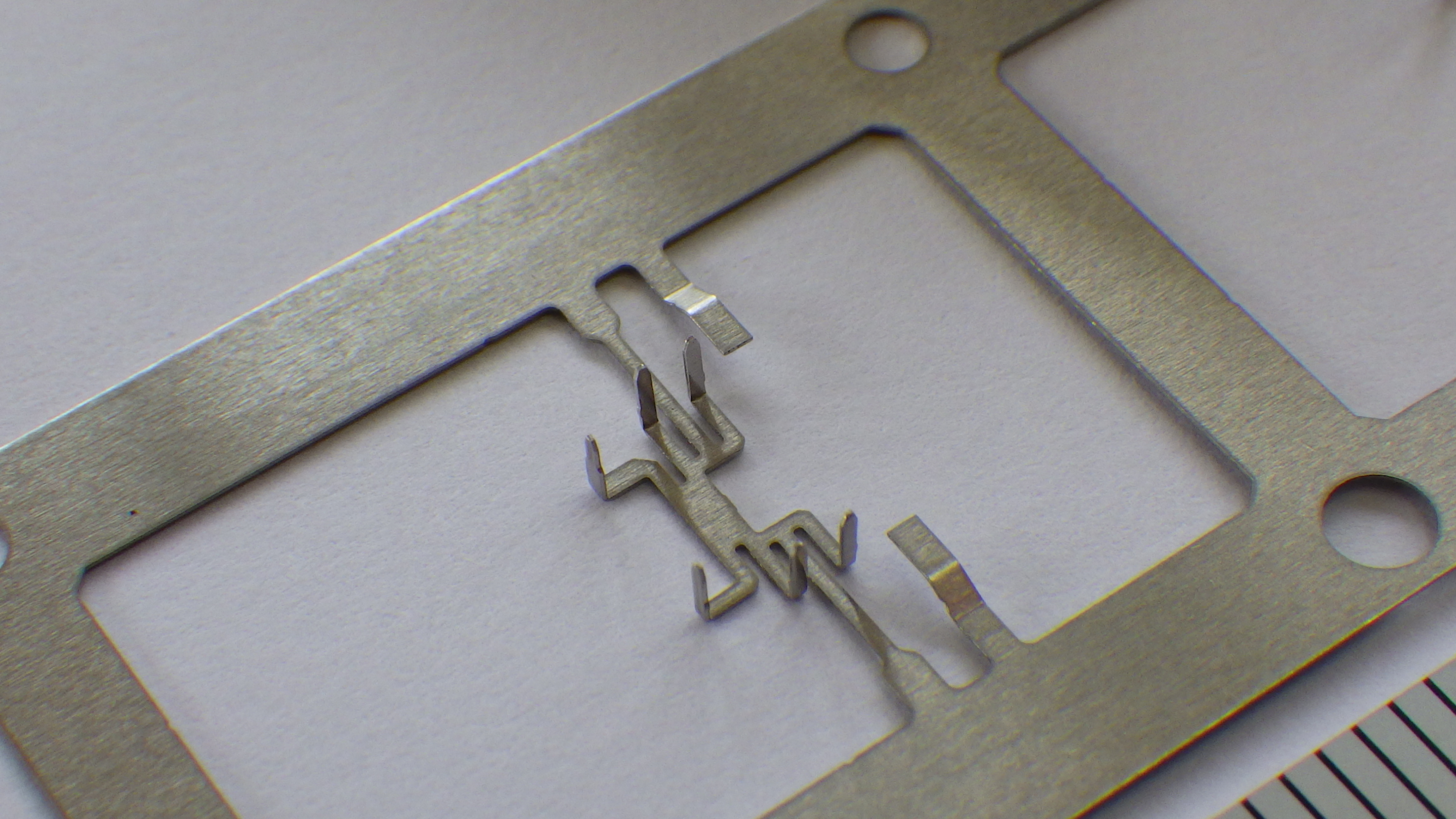 こちらのリードフレームは、プレス加工を行った後にインサートされて使用されます。端子幅、端子ピッチ、共に±0.01mmという高精度なプレス加工品でした。形状的には難易度は高くありませんが、継続精度が求められるプレス加工品であったため、当社の量産順送プレス金型にて製造したいとのことでご依頼いただきました。