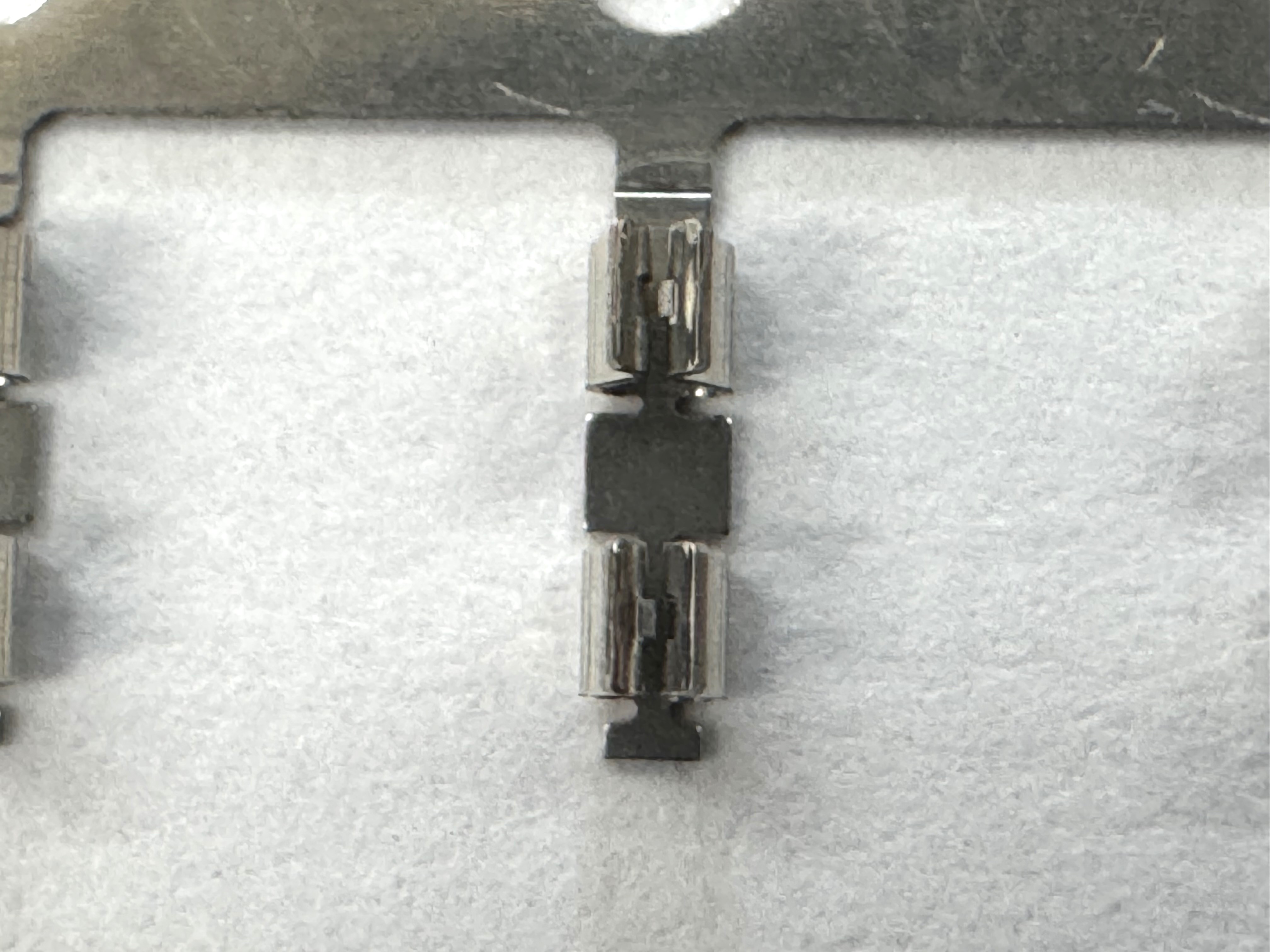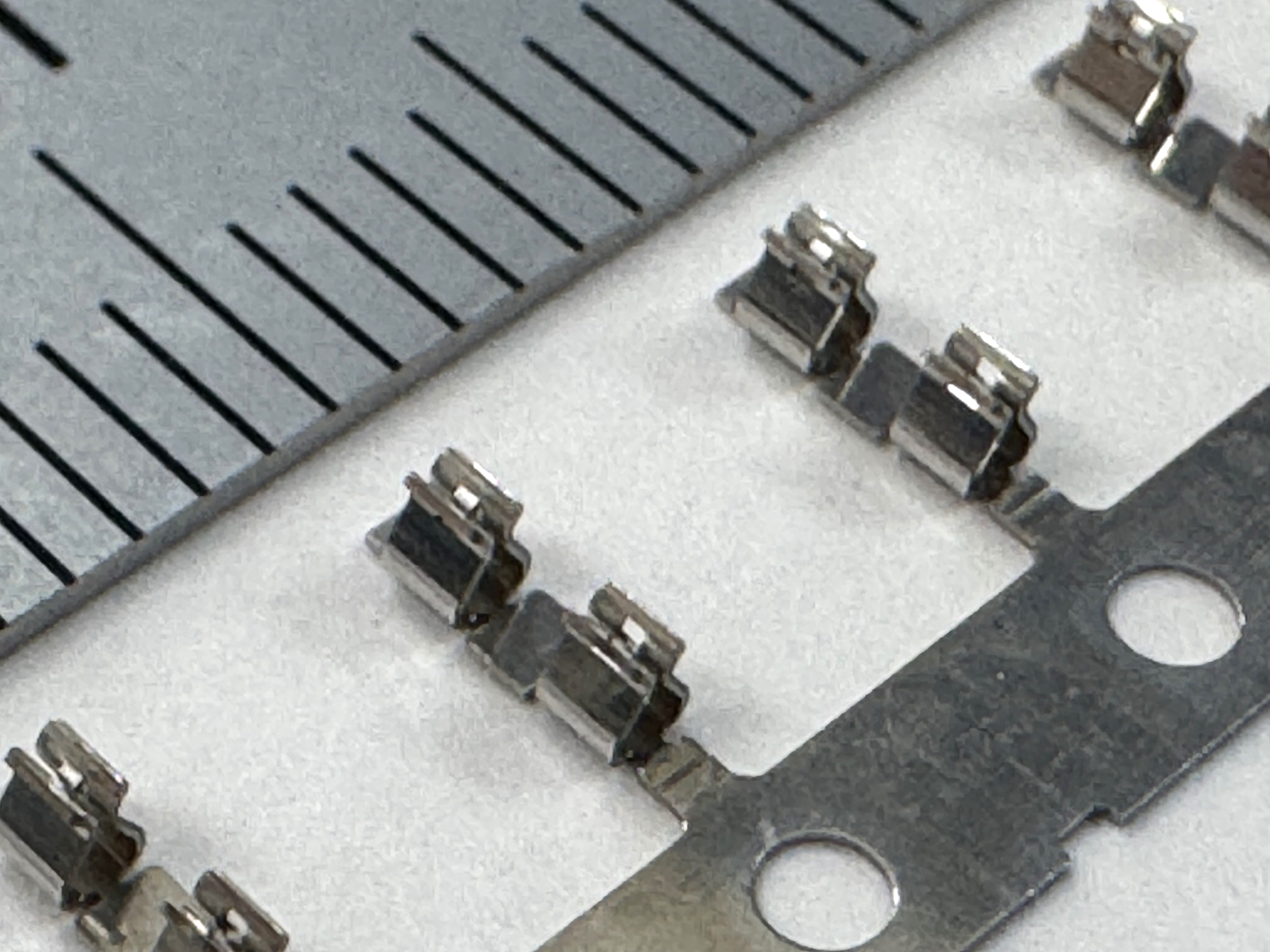 こちらのクリップの材質は非常に硬く、スプリングバックが大きい材質でした。そのため製造においては、特に曲げ工程において工夫を凝らし、接触部が密着するよう調整いたしました。また、接触部にはダボがあり、通常通り曲げ加工を行うと起点部分に破れが生じる懸念がありました。そのため当社では、工具形状に独自の工夫を施すことで、破れの発生を未然に防ぎ、高精度な製品を実現いたしました。