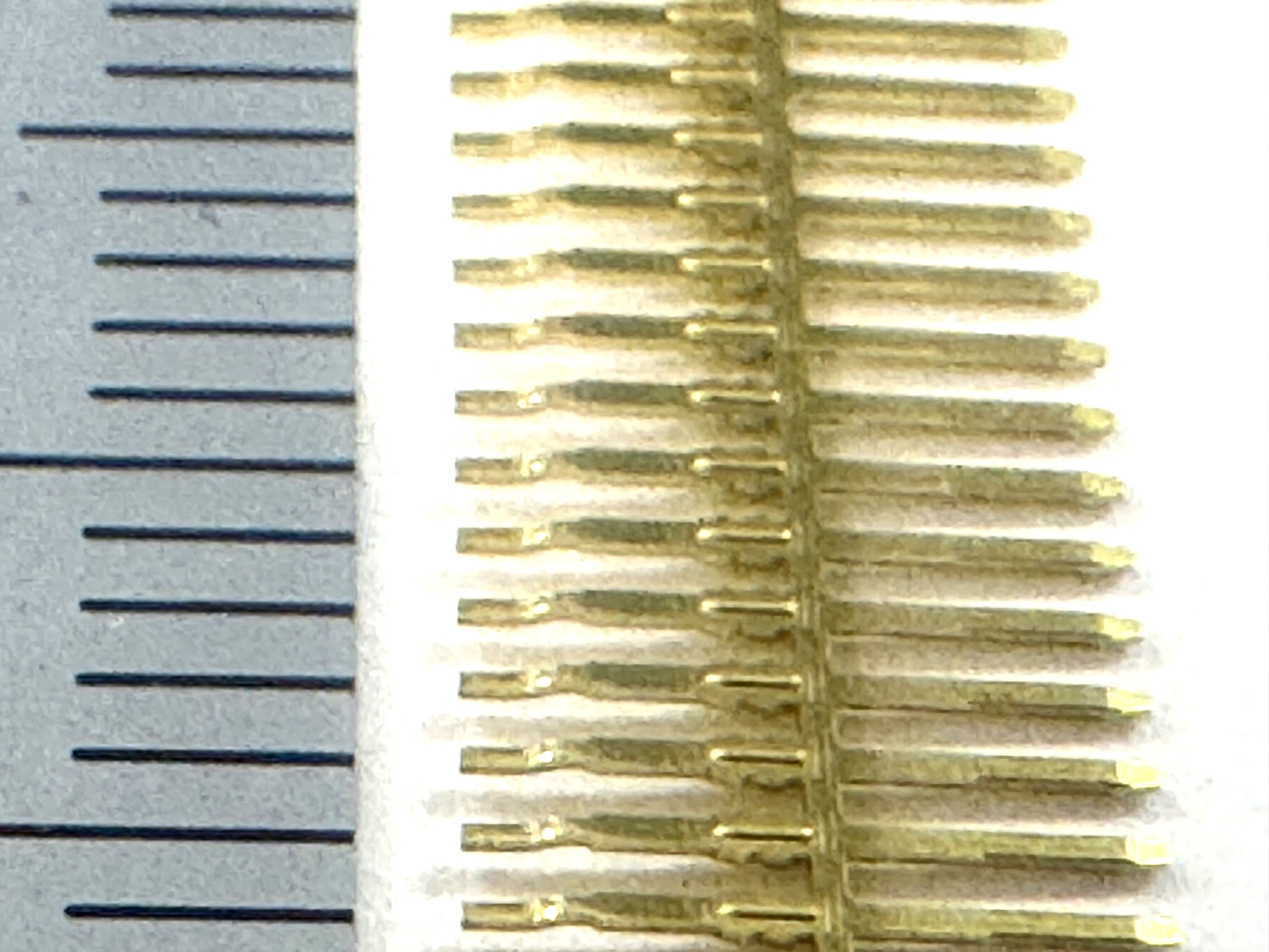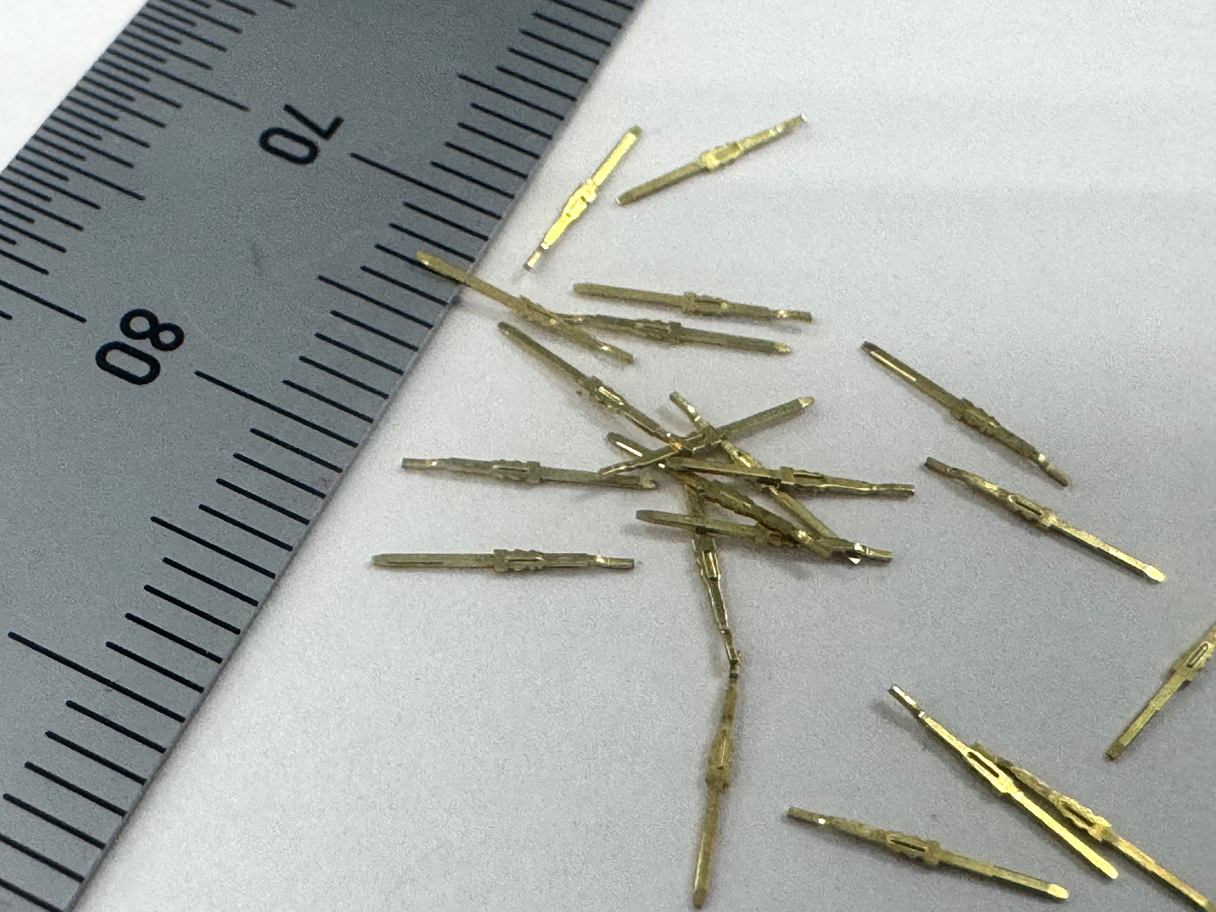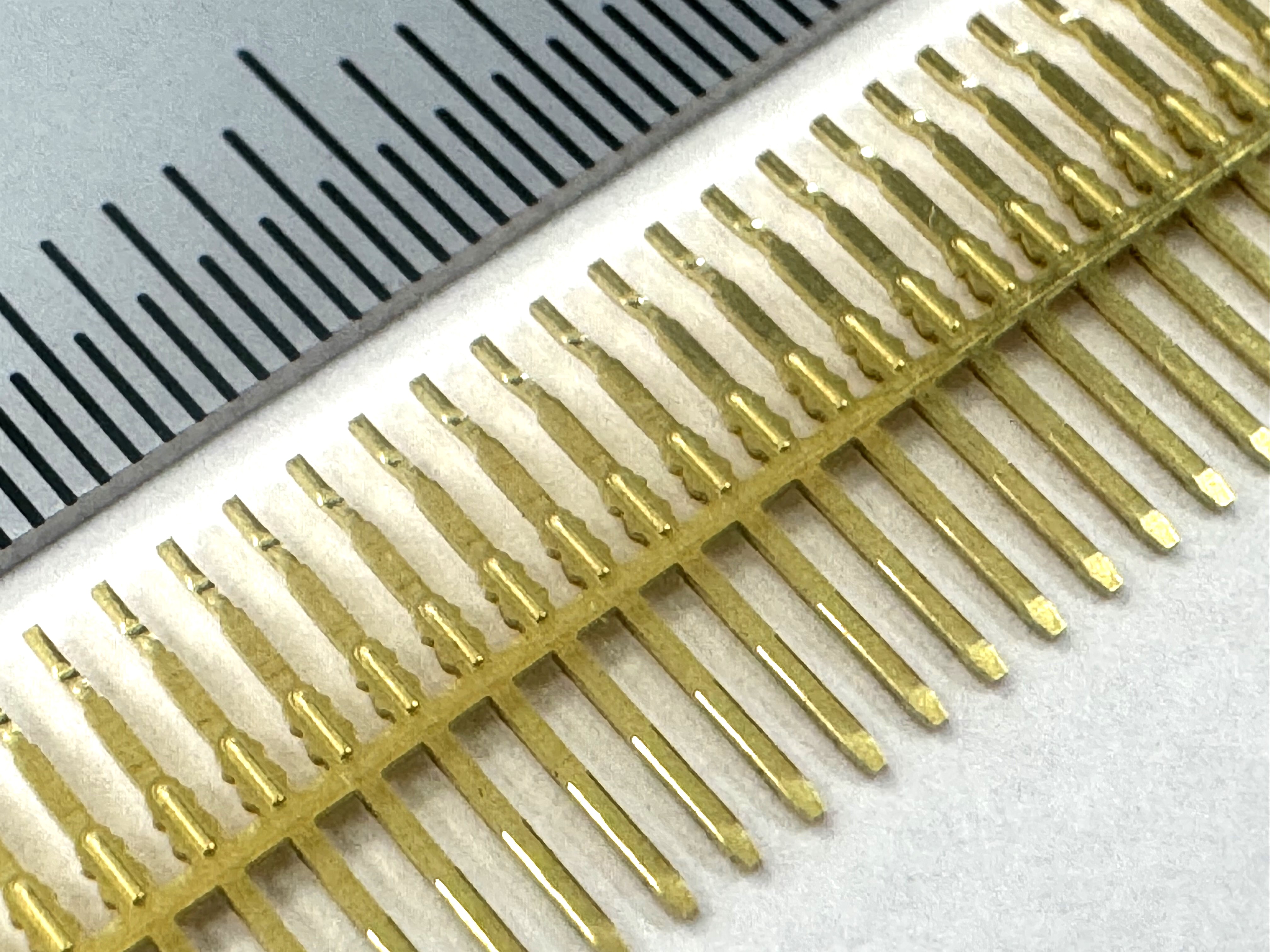こちらは、民生用途のC2600R-H製ターミナル試作品です。材質はC2600R-H、板厚は0.25mmでピッチは1mm、試作順送プレス金型にて製造いたしました。