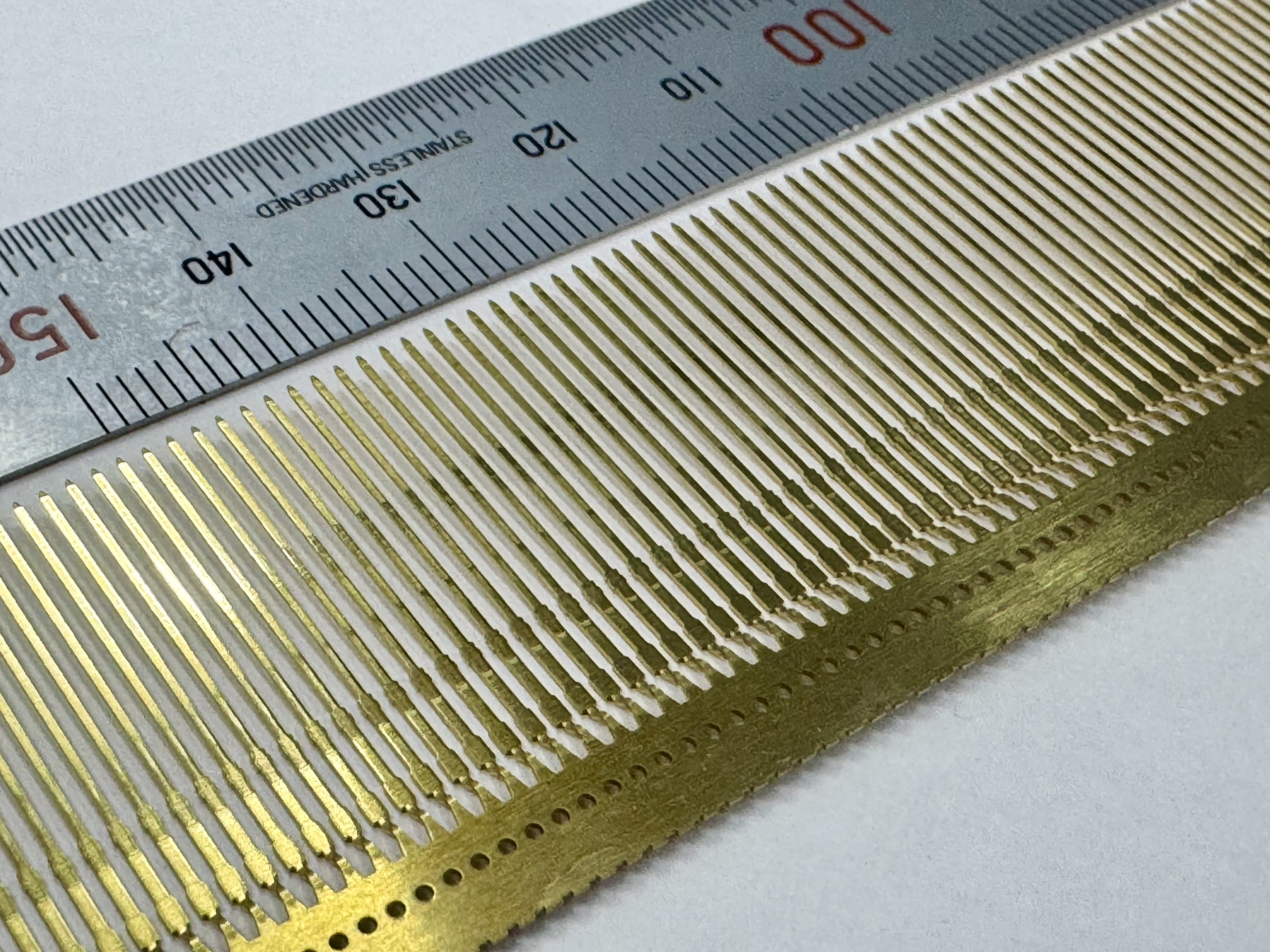 こちらは、車載用途のC2680R-EH製コンタクトです。板厚0.3mm、ピッチ1.27mmで、量産順送プレス金型にて製造しております。