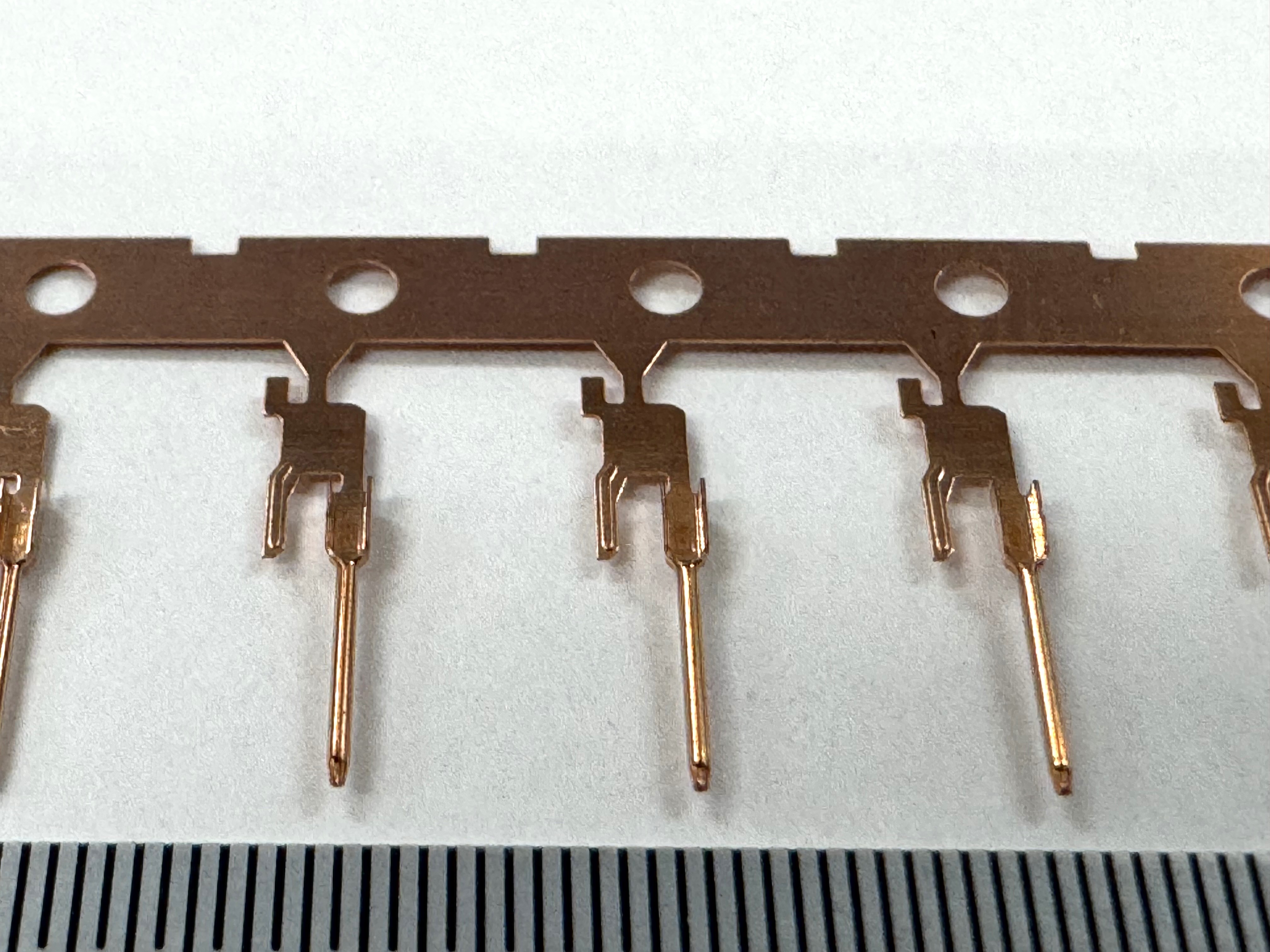 こちらは、民生用途のMAX251製コンタクト(POST CT 0.44)です。板厚0.1mm、ピッチ6.5mmで、量産順送プレス金型(更新型)にて製造しております。