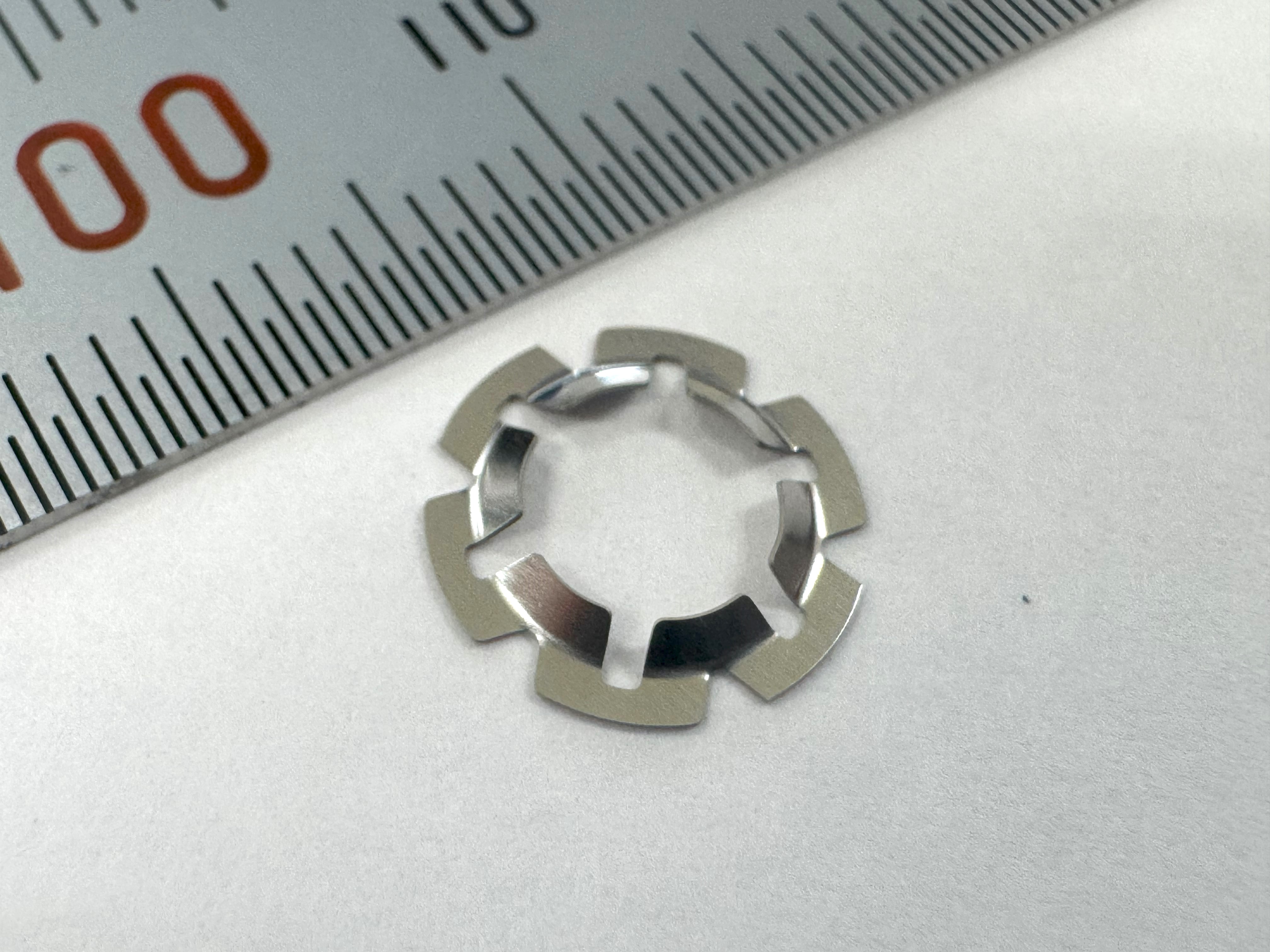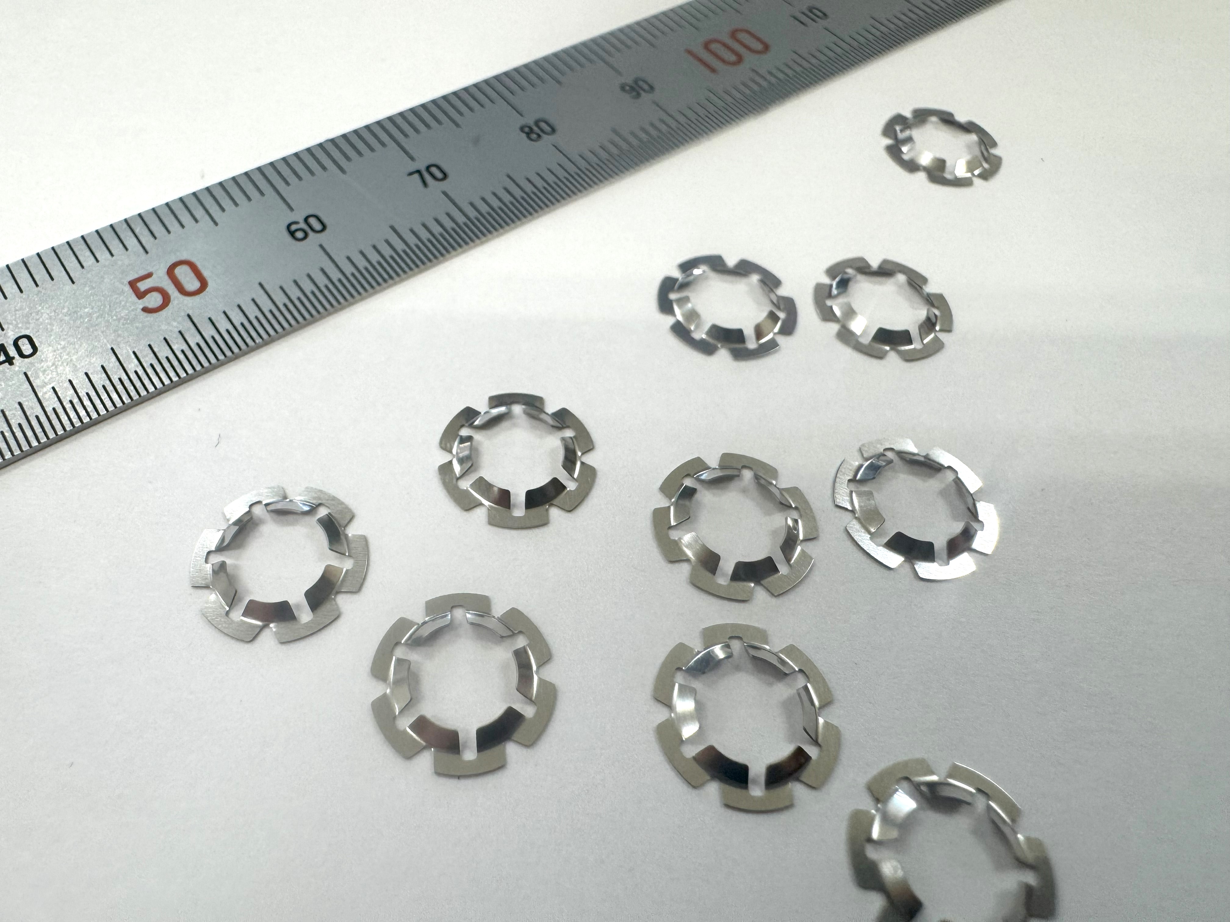 こちらは、民生用途のSUS304-H製ロックリング試作品です。板厚0.15mm、単発金型による打ち抜き仕様で、試作ロット数100個向けに製造いたしました。