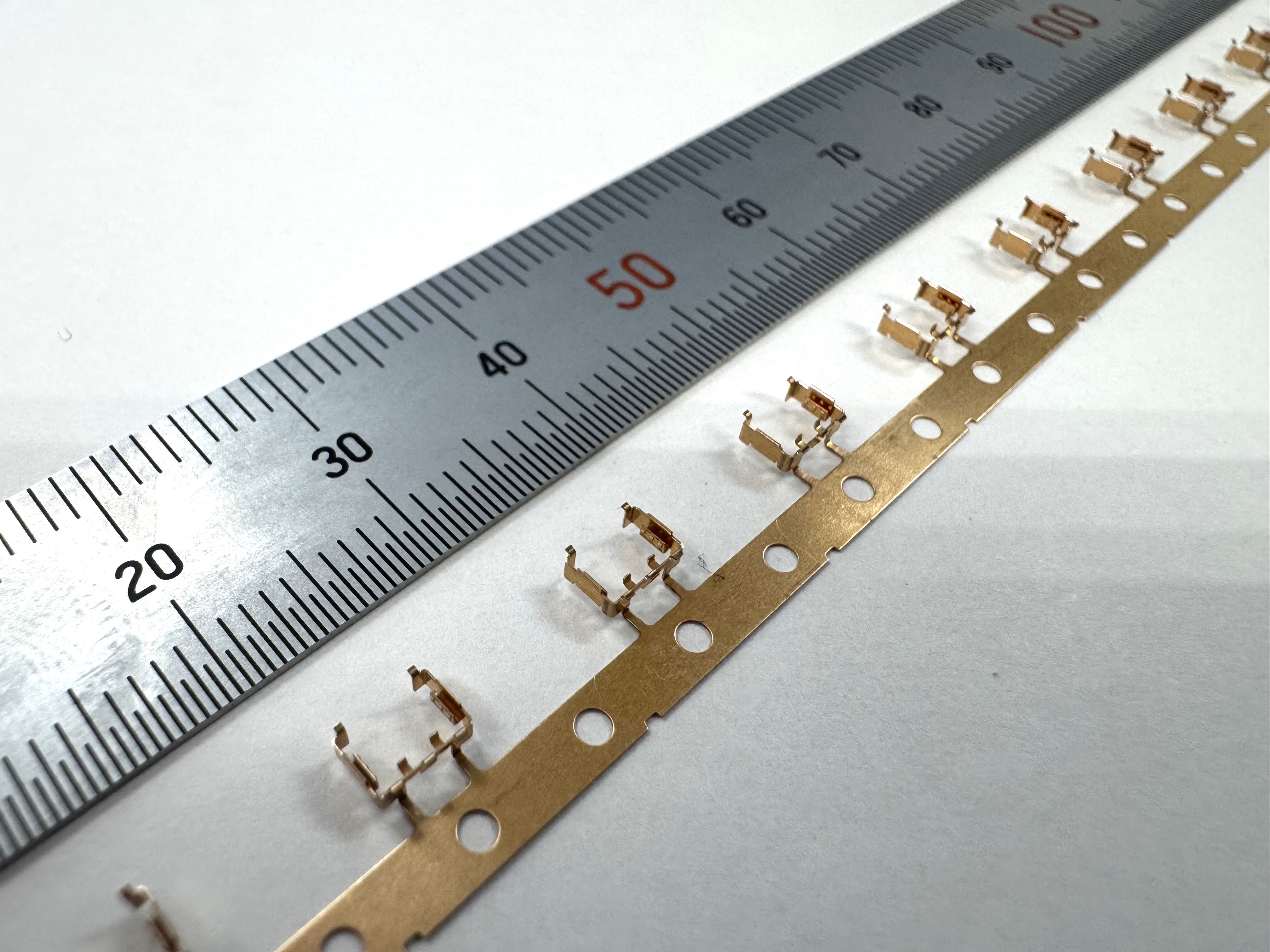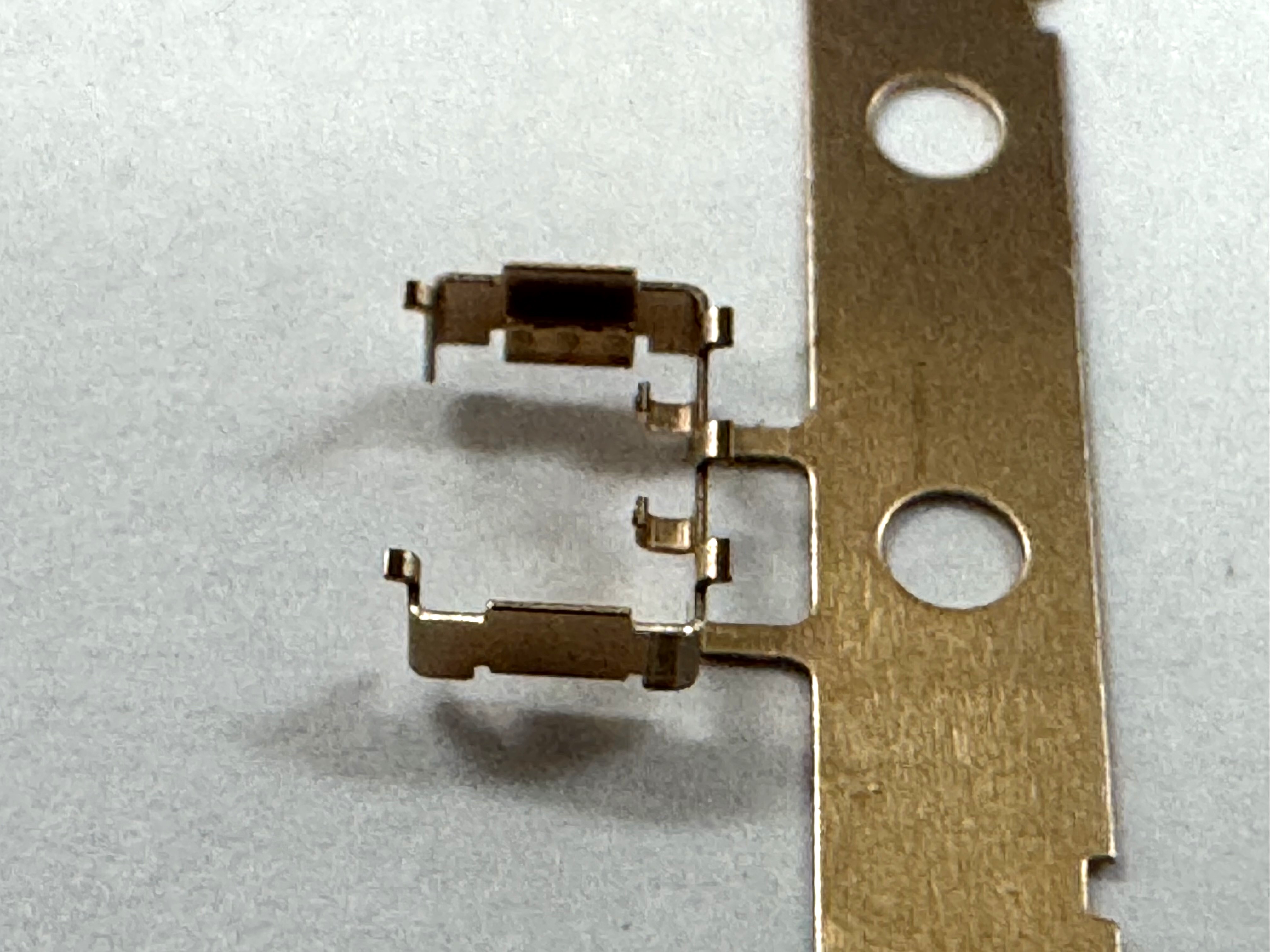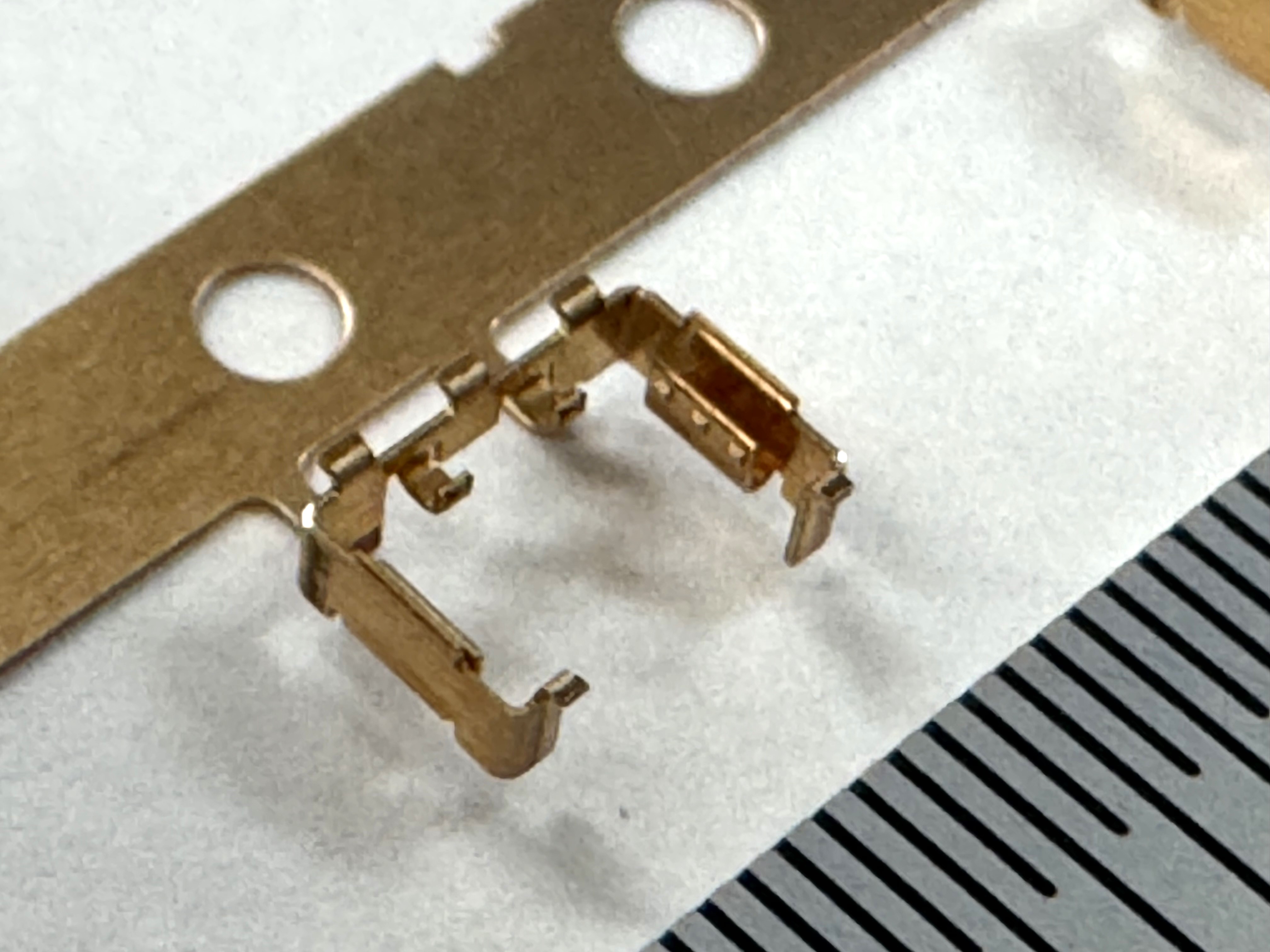 本製品は、特殊な形状のダボ加工が含まれており、かつその形状公差が非常に厳格であったため、金型製作において度重なるトライ&エラーを必要としました。また、複雑に組み合わさった曲げ形状の寸法公差が±0.02mmという厳しい制約の中にあり、量産時においていかに寸法を安定させるかが大きな技術的課題となりました。これらの特殊形状と複合的な曲げ加工が重なることで、最終的な最小公差±0.01mmの達成を非常に困難なものにしていました。