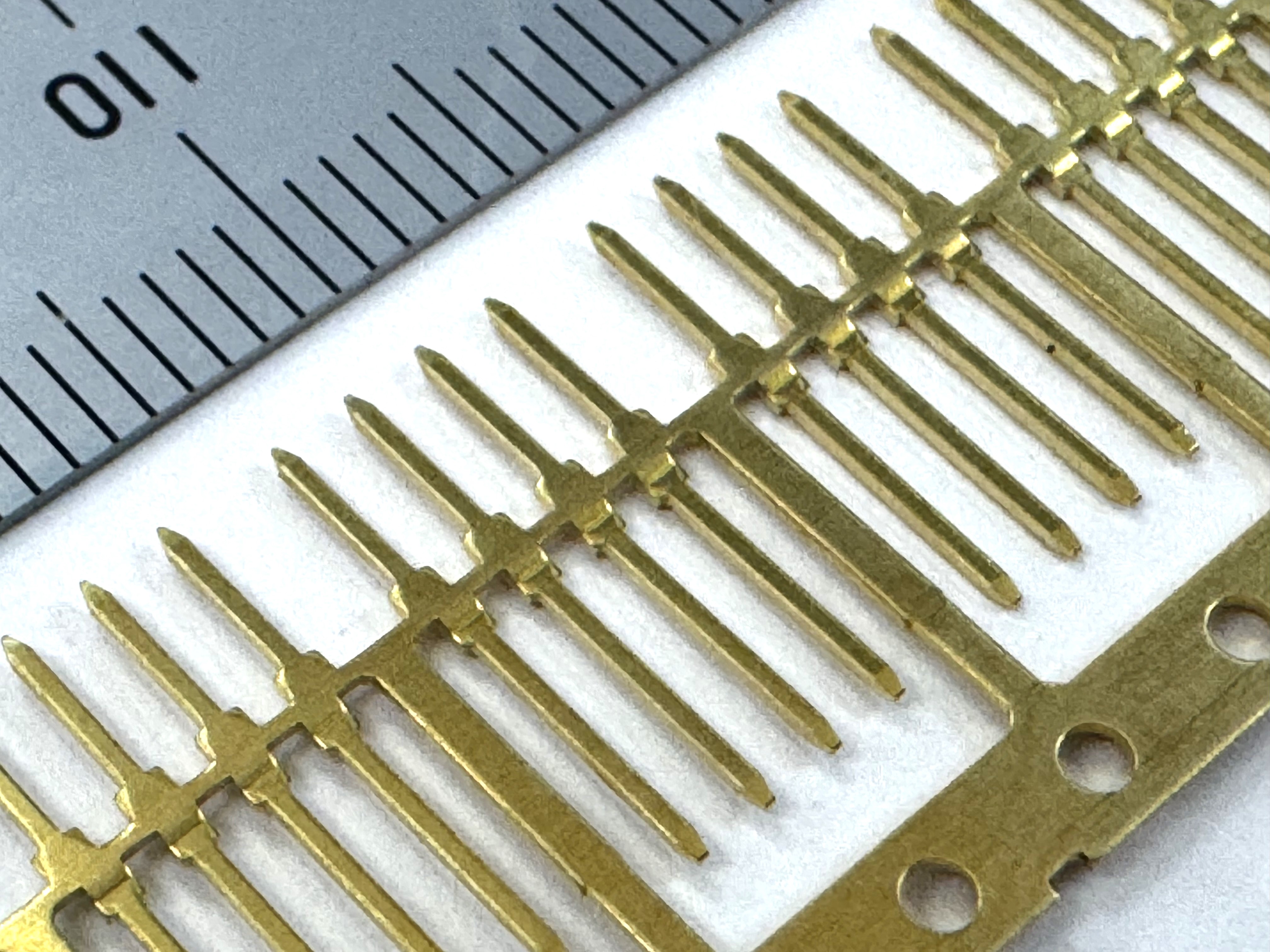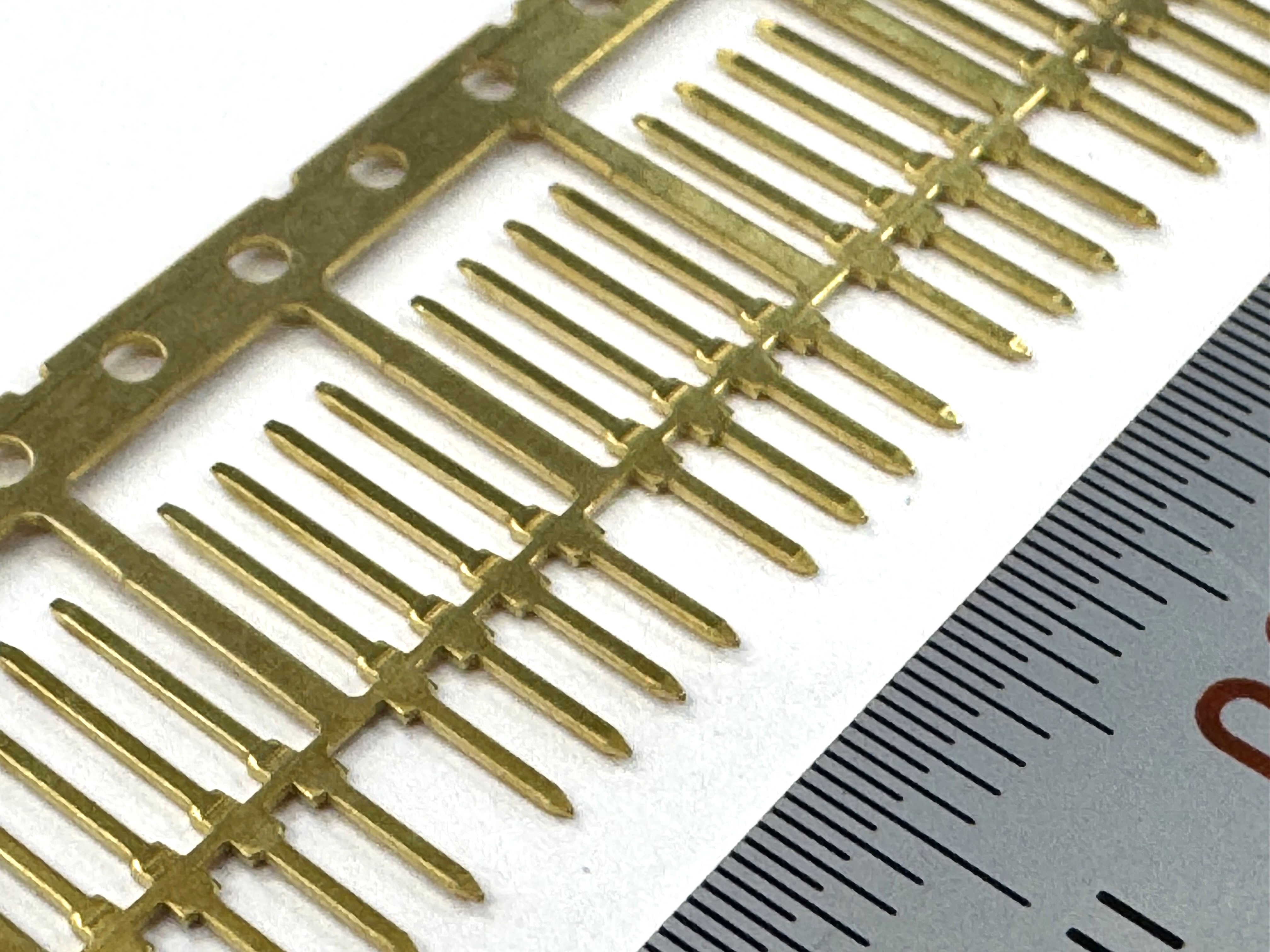 こちらは、C2680R-H製ポストの試作品です。板厚0.4mm、ピッチ9mmという仕様で、試作順送プレス金型にて製造いたしました。