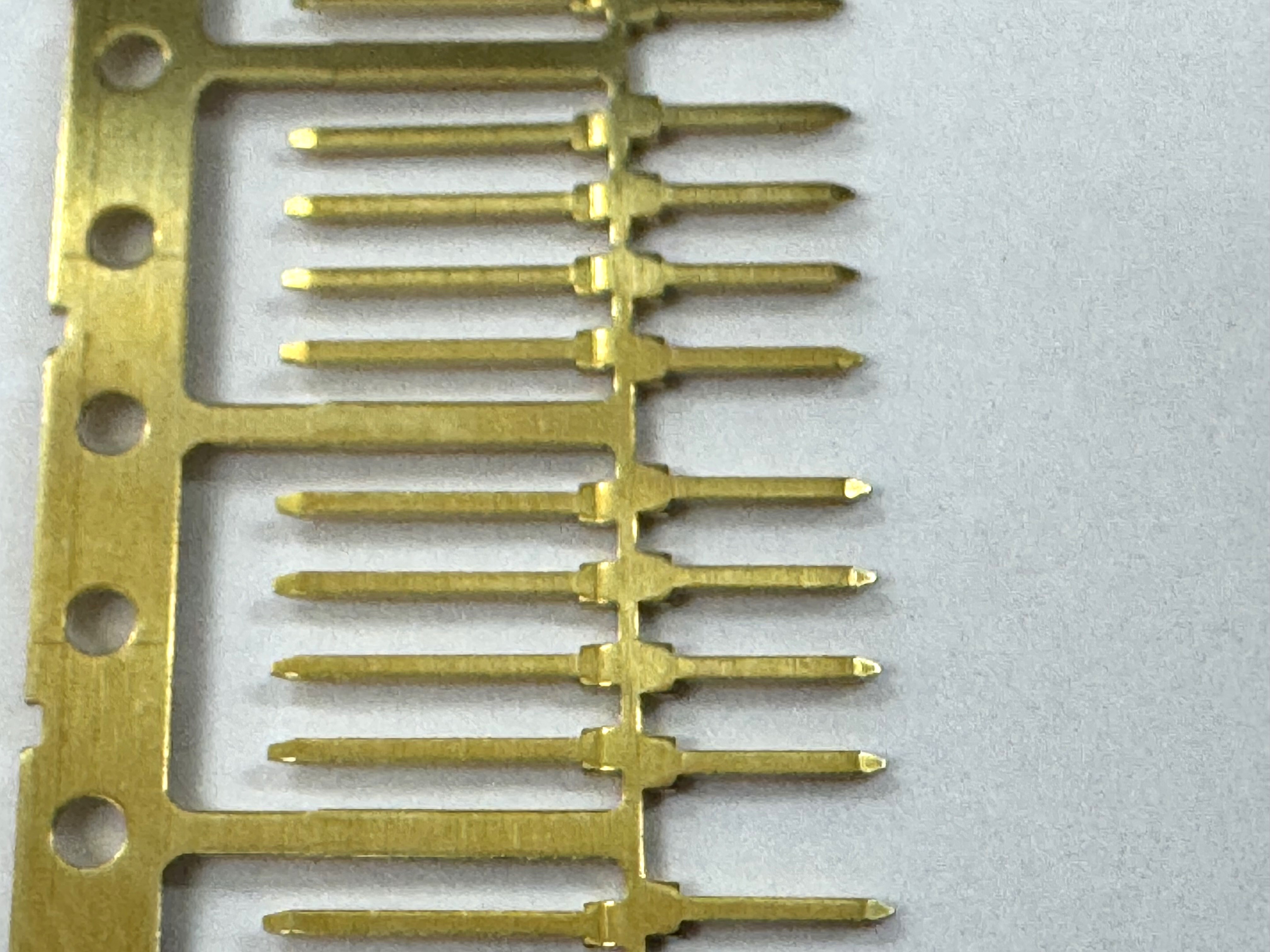 当社では、長年培ってきた精密金型設計のノウハウを活かし、この難題を克服いたしました。抜き加工時の製品の転びを物理的に抑制する金型構造を採用し、材料の挙動を安定させることで、ねじれのない正確な端子形状を確保いたしました。また、0.1mmという微細なZ曲げに対しても、金型部品の精密な調整と成形条件の最適化を図ることで、狙い通りの寸法精度を達成し、高品質な試作を可能にいたしました。